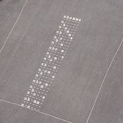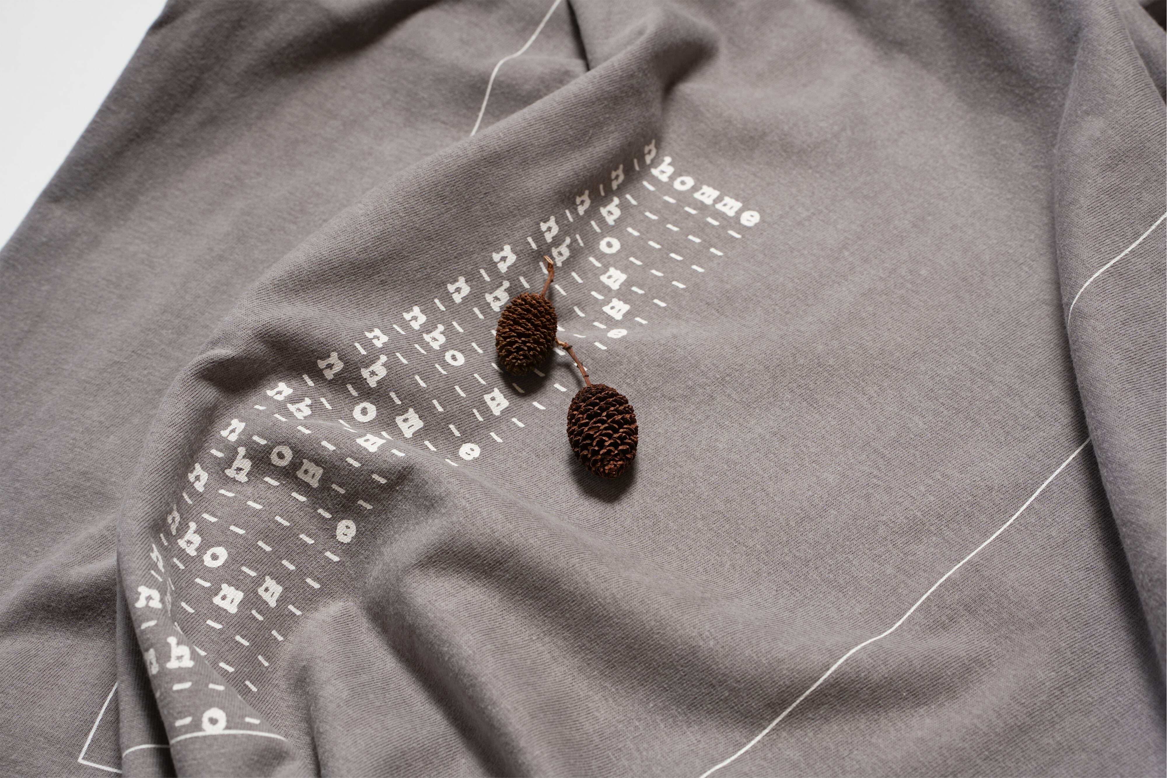 矢車附子(ヤシャブシ)の実と木酢酸鉄液を用い、白地のTシャツ一枚一枚を手作業で草木染めした。墨色。